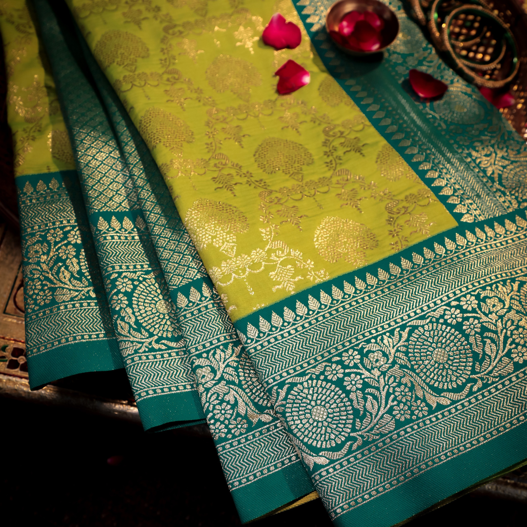 Featuring rich nylon jari work, this Kanjiwaram saree is great for any celebration or special event. The fabric provides comfort all day while the design speaks to traditional craftsmanship. It stands out for its fine detailing and gorgeous patterns, perfect for festive times like weddings or family gatherings. You’ll feel ready for anything as it lets you move around without restriction and catches the eye.