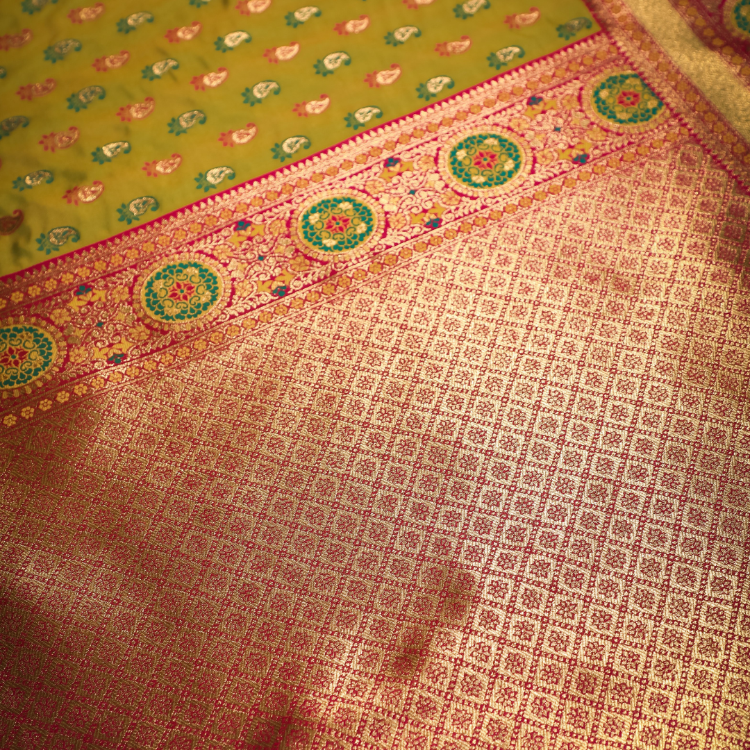 This Katan Silk saree with patli patterns and delicate meenakari work is great for special occasions.