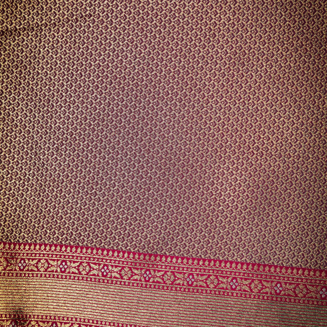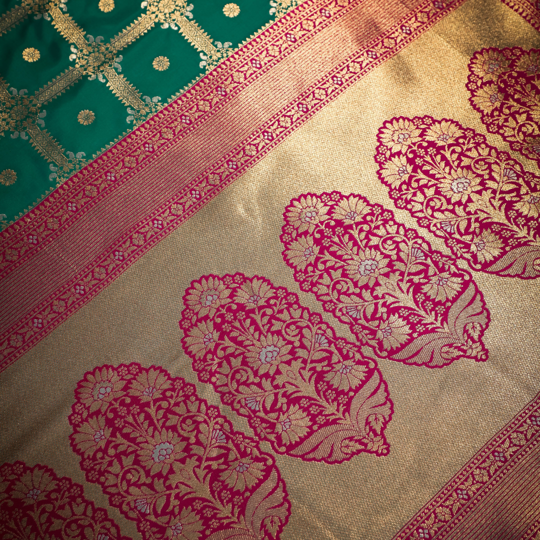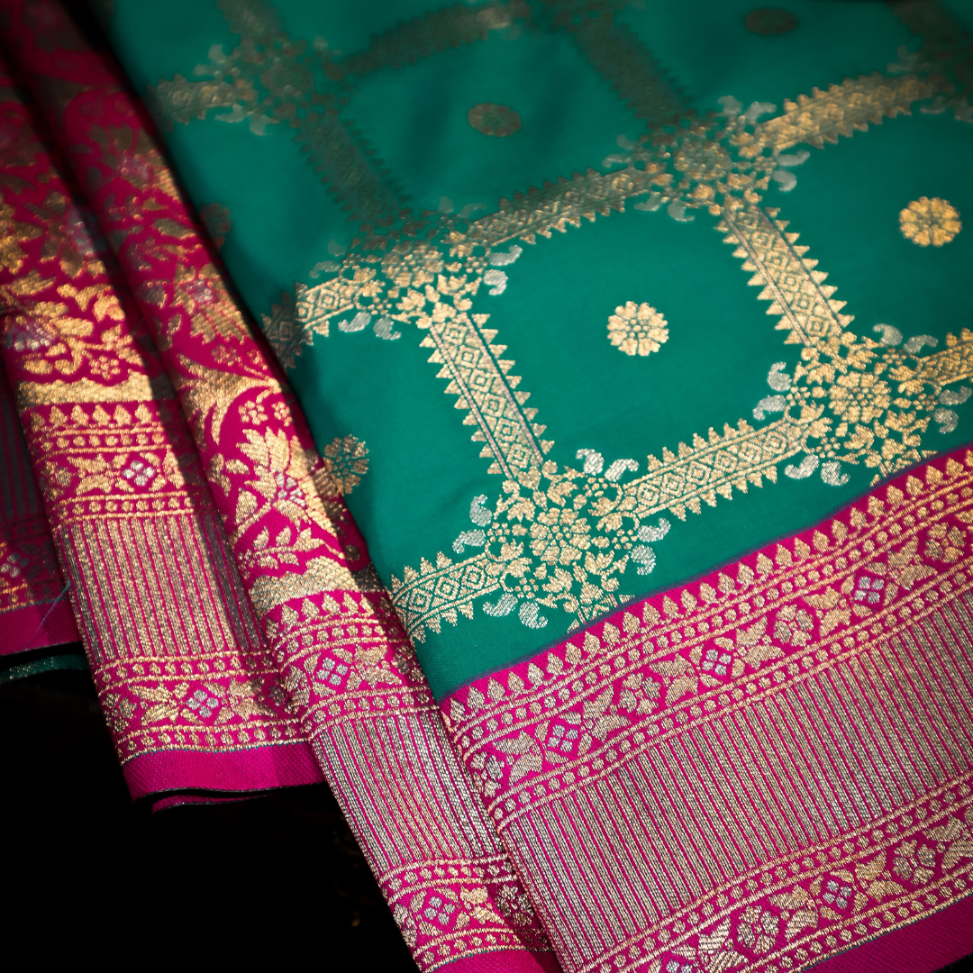 A vibrant Katan Silk saree showcasing Patola-inspired patterns with detailed Silver Jari and meenakari elements.