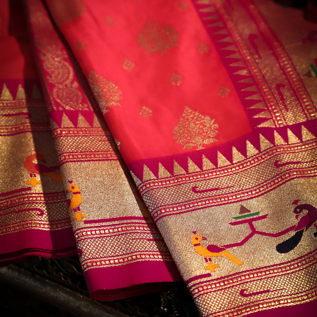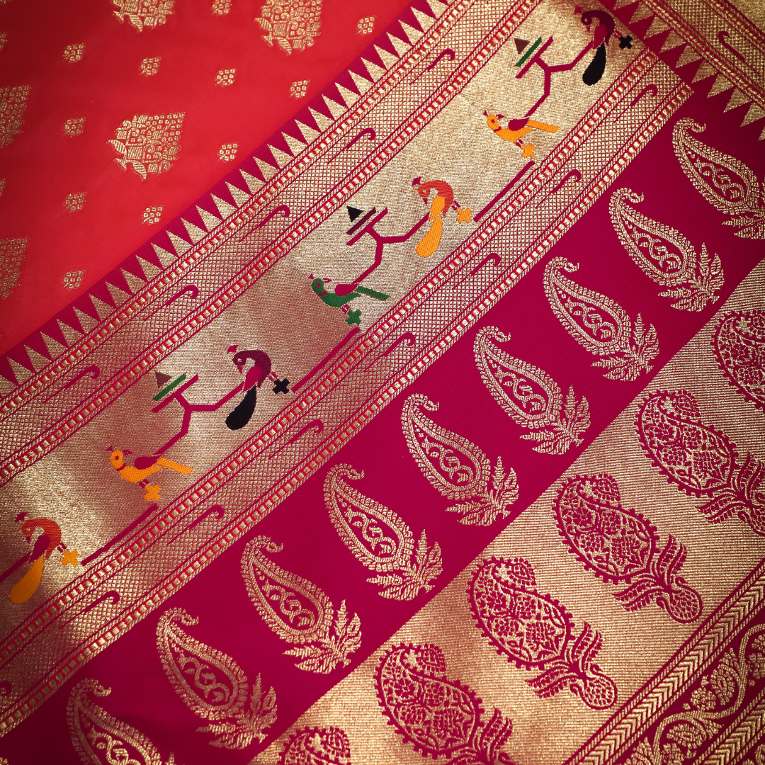 A rich and vibrant Paithani saree with intricate meenakari work and shining Anmol Jari highlights.